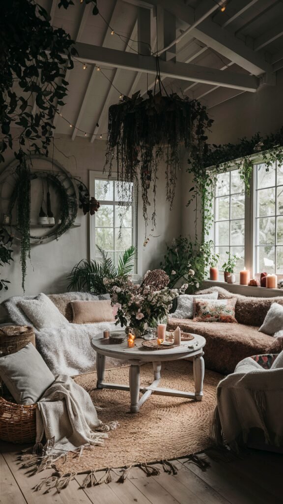 If there’s one word to describe the fairycore living room, it’s “cozy.” This style is perfect for those who love to curl up in a warm blanket with a good book, surrounded by soft lighting and nature-inspired décor. The key to a cozy fairycore living room is to focus on comfort. Fill your space with plush cushions, soft blankets, and plenty of fairy lights. The color palette should be warm and inviting. Soft neutrals and pastels make the room feel like a snug, magical retreat. Don’t forget to incorporate natural textures like wicker baskets, woolen throws, and wooden furniture for that extra touch of warmth.