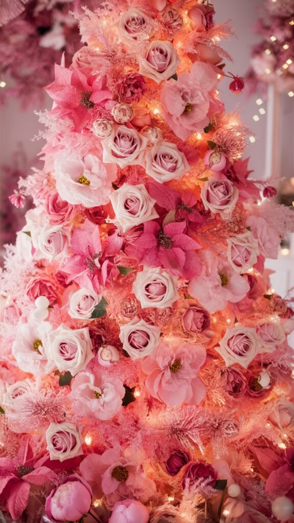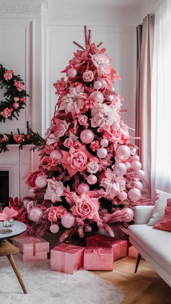 Add a natural, romantic touch to your pink Christmas tree with flowers. Silk roses, poinsettias, or peonies in matching shades bring softness and texture. With floral decorations, you can create a tree that feels lush and unique, filling the room with the beauty of a winter garden.