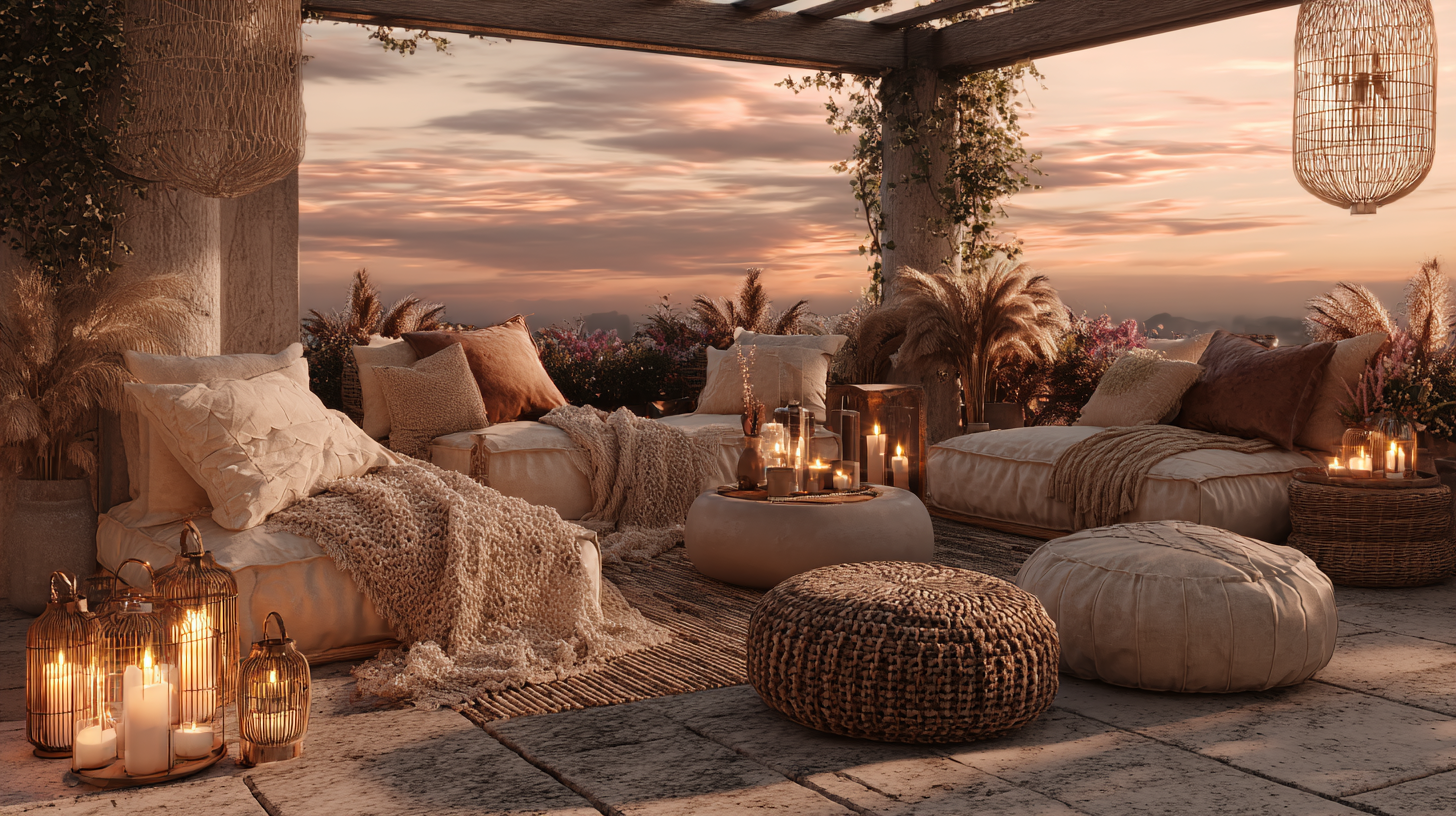 - Materials: terracotta brick pavers, jute poufs, weathered wood, chunky knit textiles, vintage-patterned outdoor rug