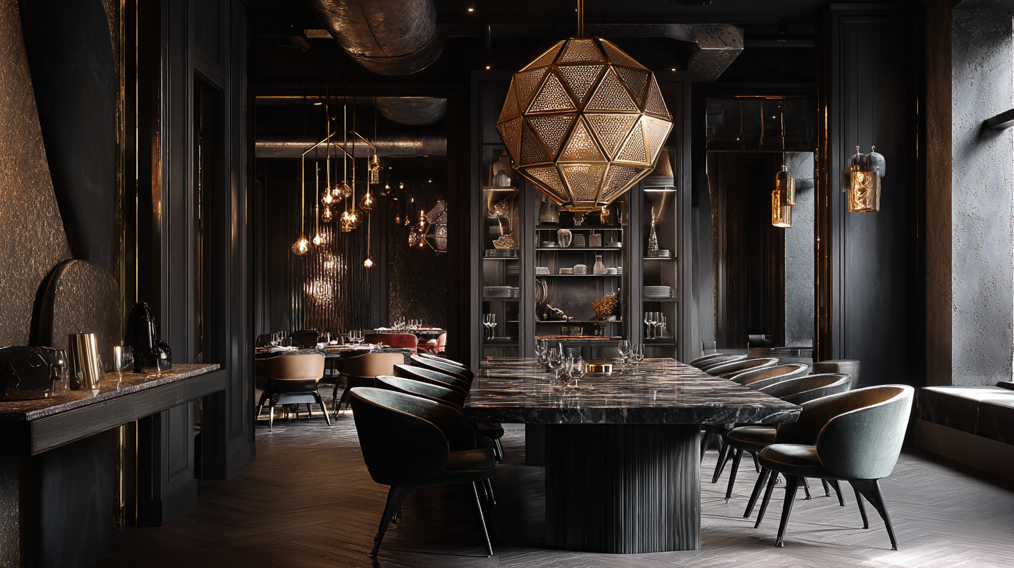 Tom Dixon dining rooms play with monochrome palettes and bold forms. Dark tones, metallic finishes, and dramatic lighting create mood and depth. This style feels edgy yet intimate.