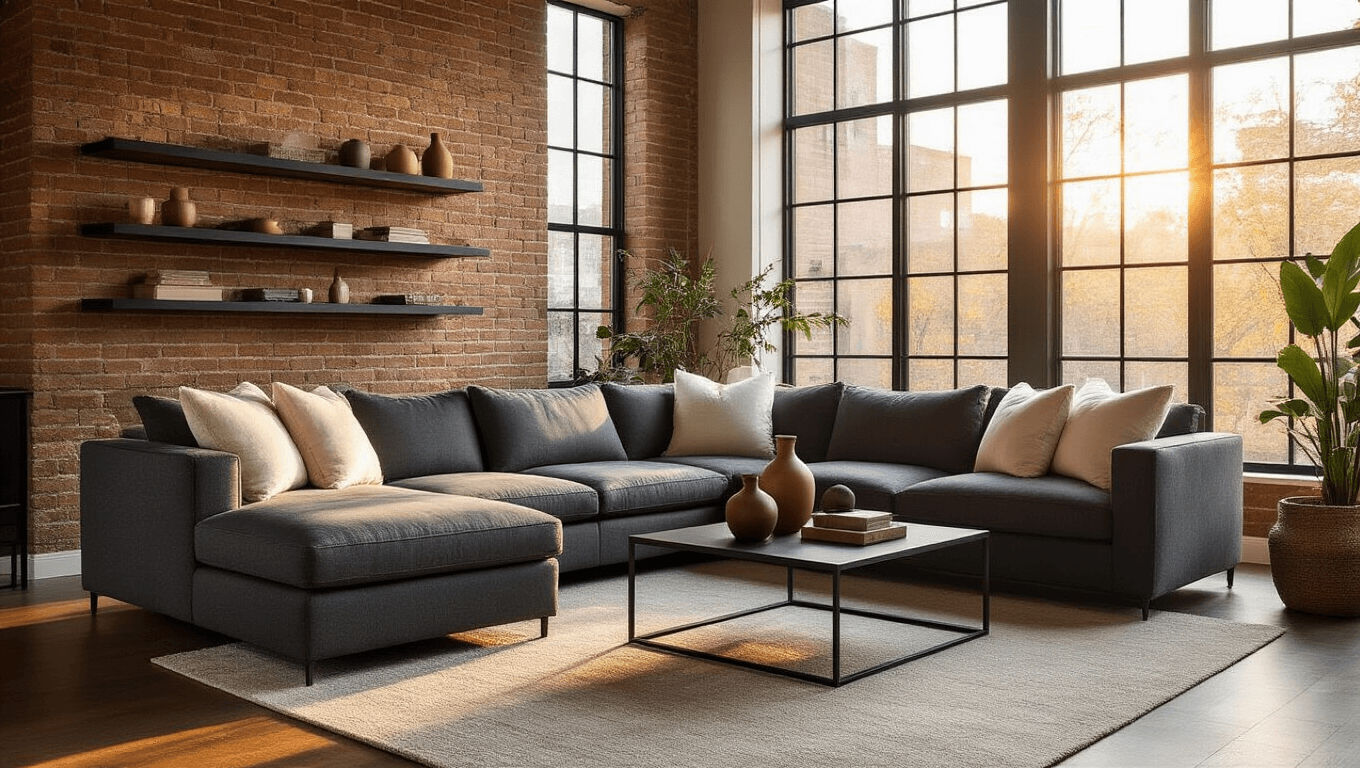 The living room is often the heart of the home, a place where family and friends gather. To create a modern and inviting living room, consider using a charcoal gray sectional sofa paired with cream pillows for a touch of elegance. Add a black metal coffee table with ceramic vases to enhance the visual appeal. Don’t forget the details: an exposed brick accent wall with floating shelves can add character and warmth to the space.