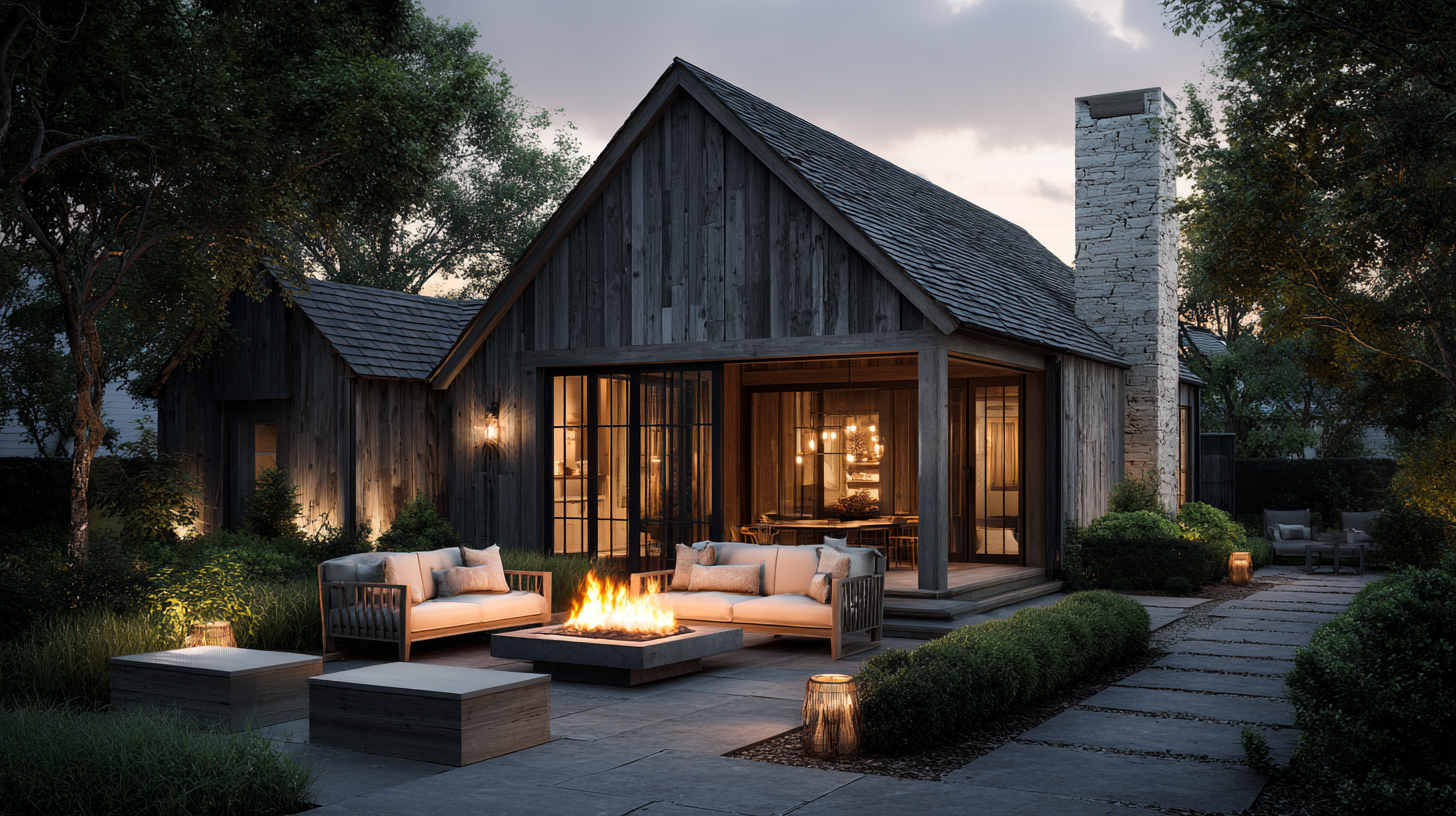 Outdoor living areas extend the usable space of a small barn house. A cozy fire pit creates a warm gathering spot for all seasons. This setup blends rustic charm with relaxed modern living.