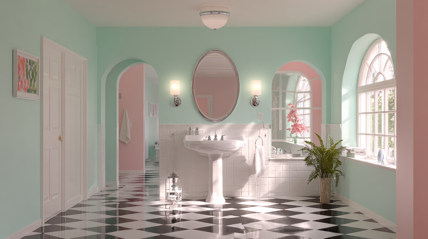 Lean into retro charm with checkered tile flooring sourced from Wayfair. Pastel walls or mint green accents give the room authentic 1950s flair. Chrome fixtures keep the look playful and bright. The space feels cheerful, nostalgic, and full of personality.