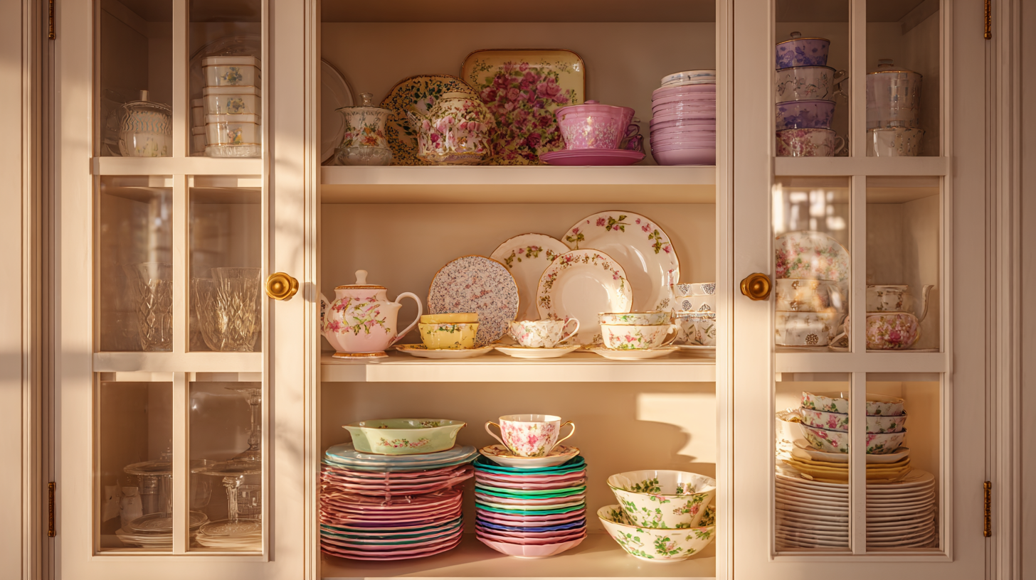 A crockery cabinet filled with vintage dishes adds instant soul to the kitchen. Stacked plates, floral teacups, and colorful Pyrex create a display that feels cheerful and personal. Glass front doors make everything feel collected, elegant, and easy to admire. This feature brings warmth, beauty, and timeless charm into the room.