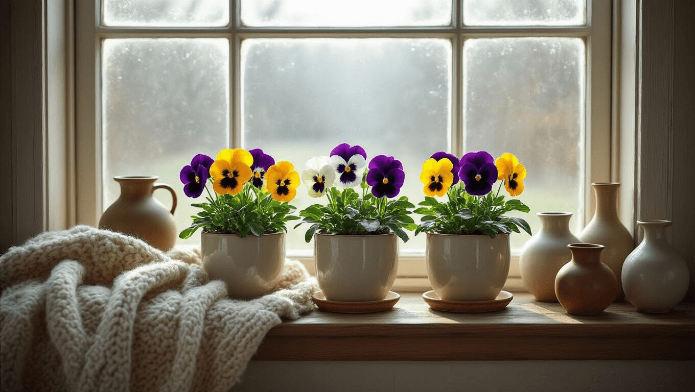 <img src="https://evyvehomes.com/wp-content/uploads/2026/01/2398scandinavian-winter-pansies-living-room.png" alt="A Scandinavian-inspired living room corner with winter pansies in minimal white ceramic planters, large windows showcasing a frost-covered landscape, a soft grey wool throw, light oak floors, and a mid-century modern chair. The pansies display blush pink, pale